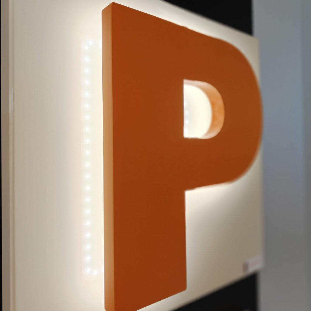 Selkeä etuvalaistus korostaa luettavuutta. Taaksepäin suunnattu valo luo rauhallisen hehkun. Reunoilta hohtava sivuvalaistus taas tuo kirjainten muodon esiin uudella tavalla.